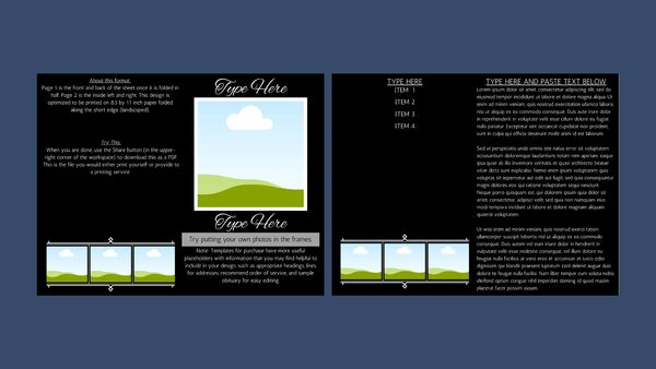 Alright, check out this Canva-powered template – it's your go-to for creating beautiful, printed service programs with an obituary tucked right inside! Just like our other Canva sample, you'll log in and get designing. The big difference? This one's crafted for printing as a PDF on standard 8.5 x 11 inch paper. Imagine the result: a neat, landscape-oriented booklet with a front, back, and two inner pages, all professionally folded in half.